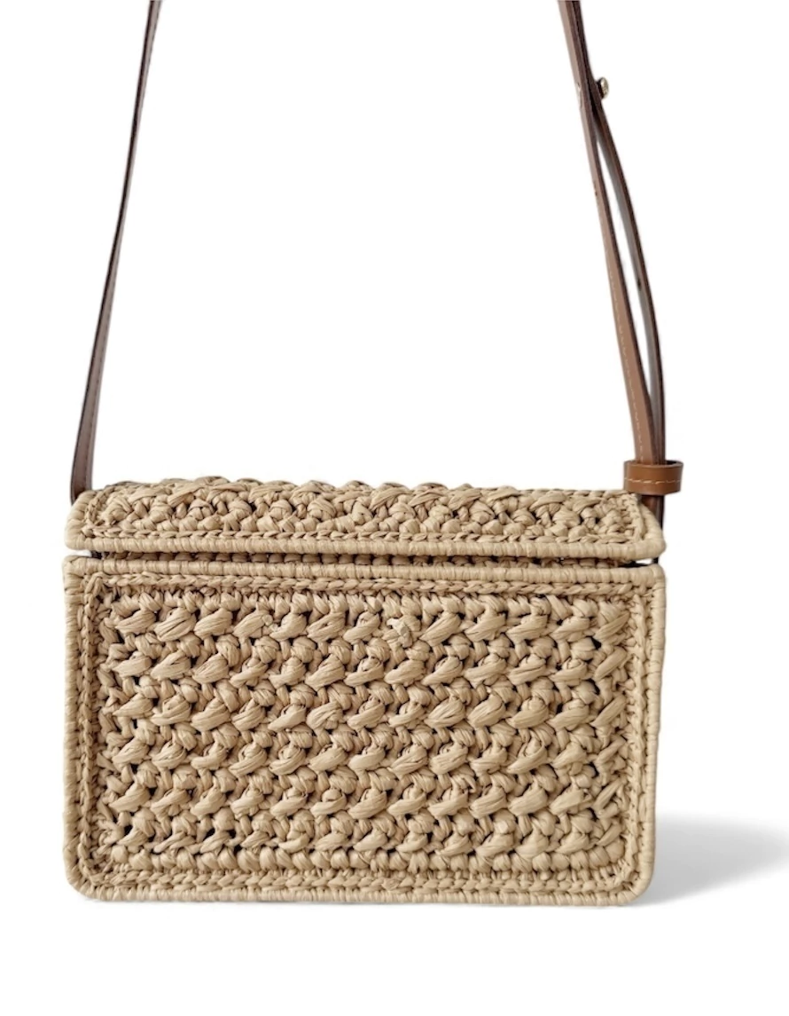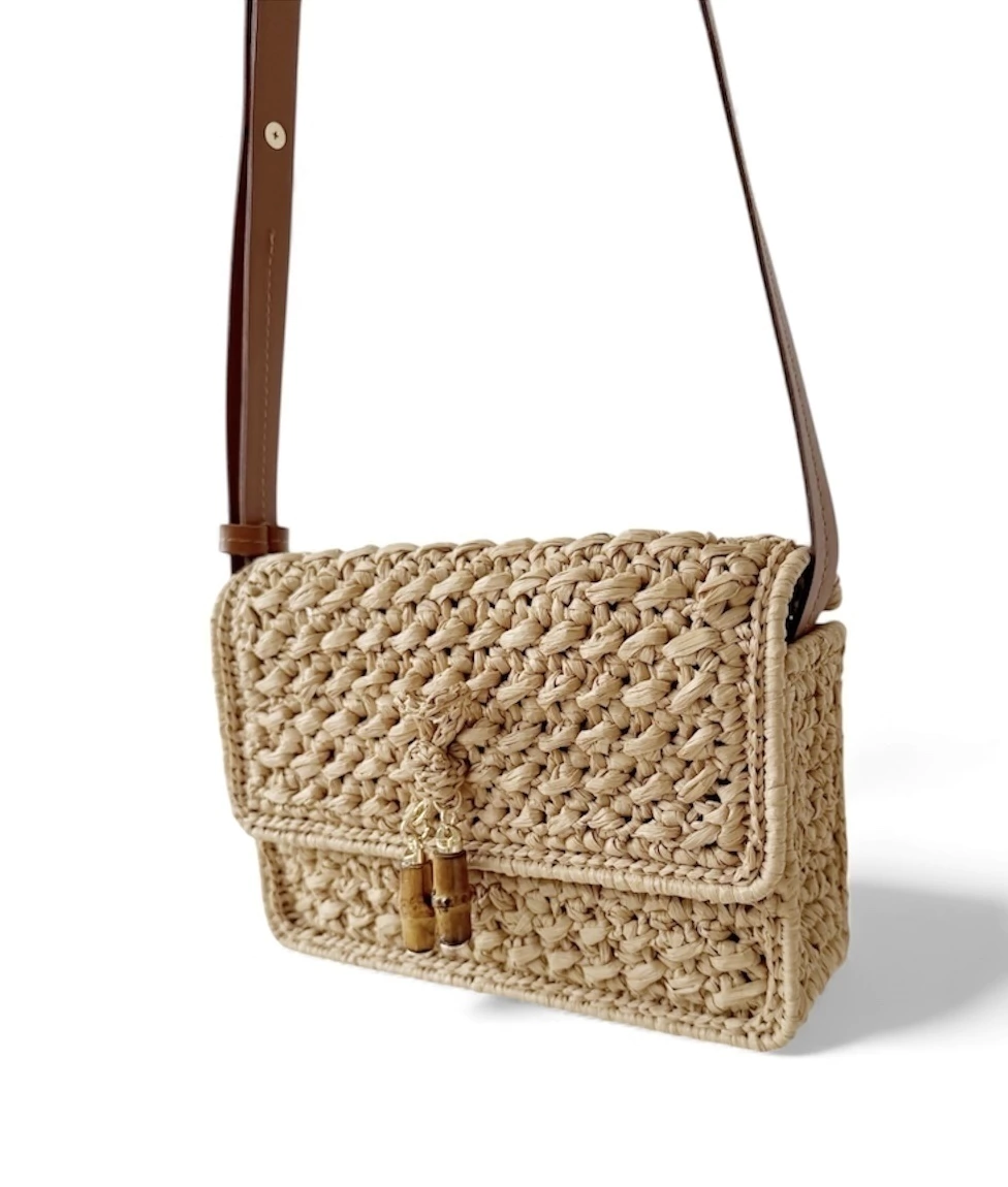 Cartera de rafia que sobre su cierre imantado, lleva un adorno tejido con punteras en caña de Bambú natural y metal dorado. La cartera esta tejida a mano sobre una base metalica con correa de cuero extensible en color tostado
