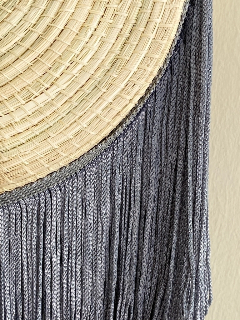 Cartera de fibras naturales (carandillo o espartillo) completamente hecha a mano, con adornos de flecos de 20cm de largo.