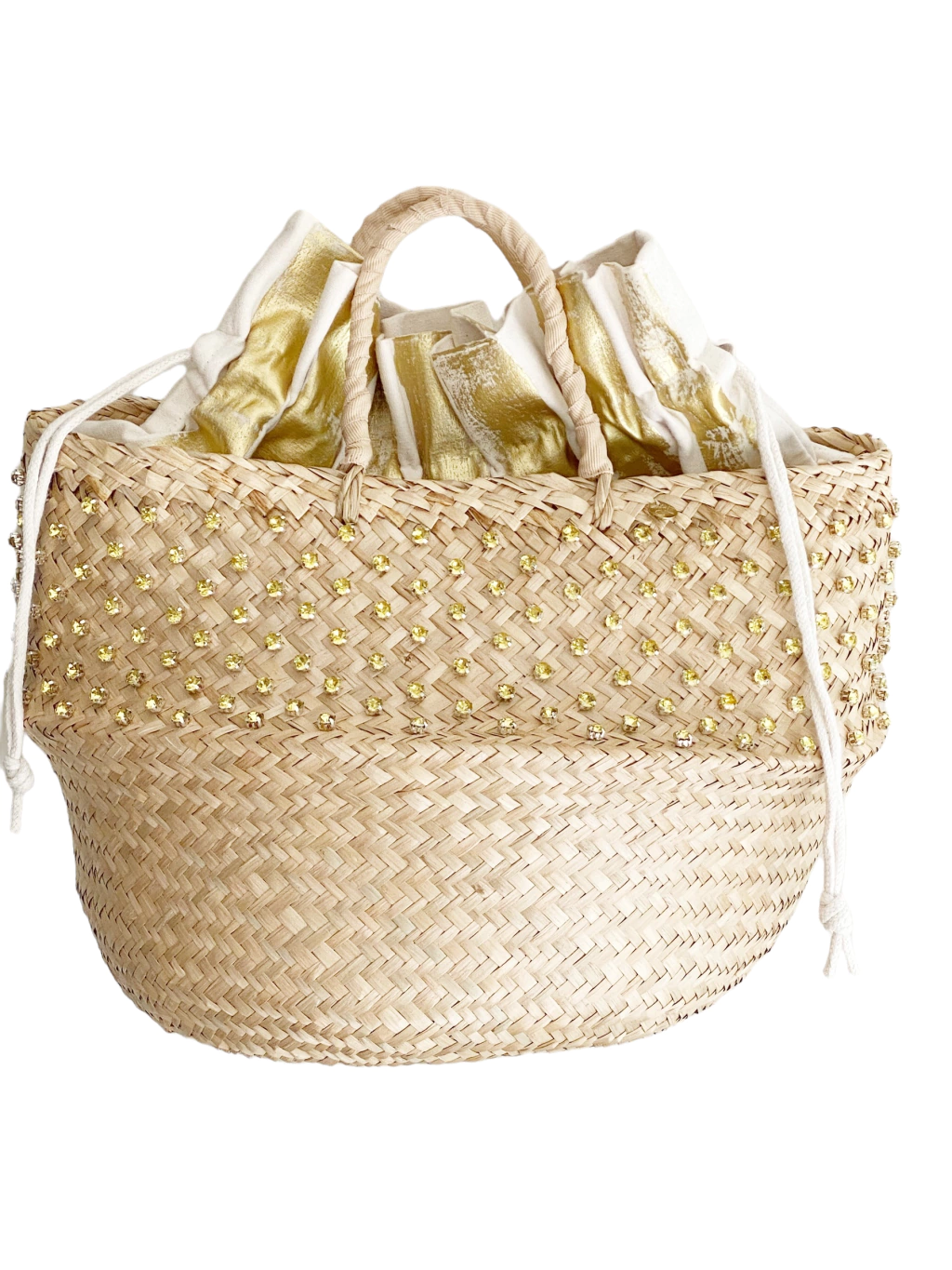 Canasto de fibra natural bordado a mano en cristales. Con interior forrado en gabardina de algodón color crudo, puede ser intervenido en color al tono metalizado con técnica de Foil. (Al hacer la compra nos comunicamos para definir, en caso de querer esta opción)