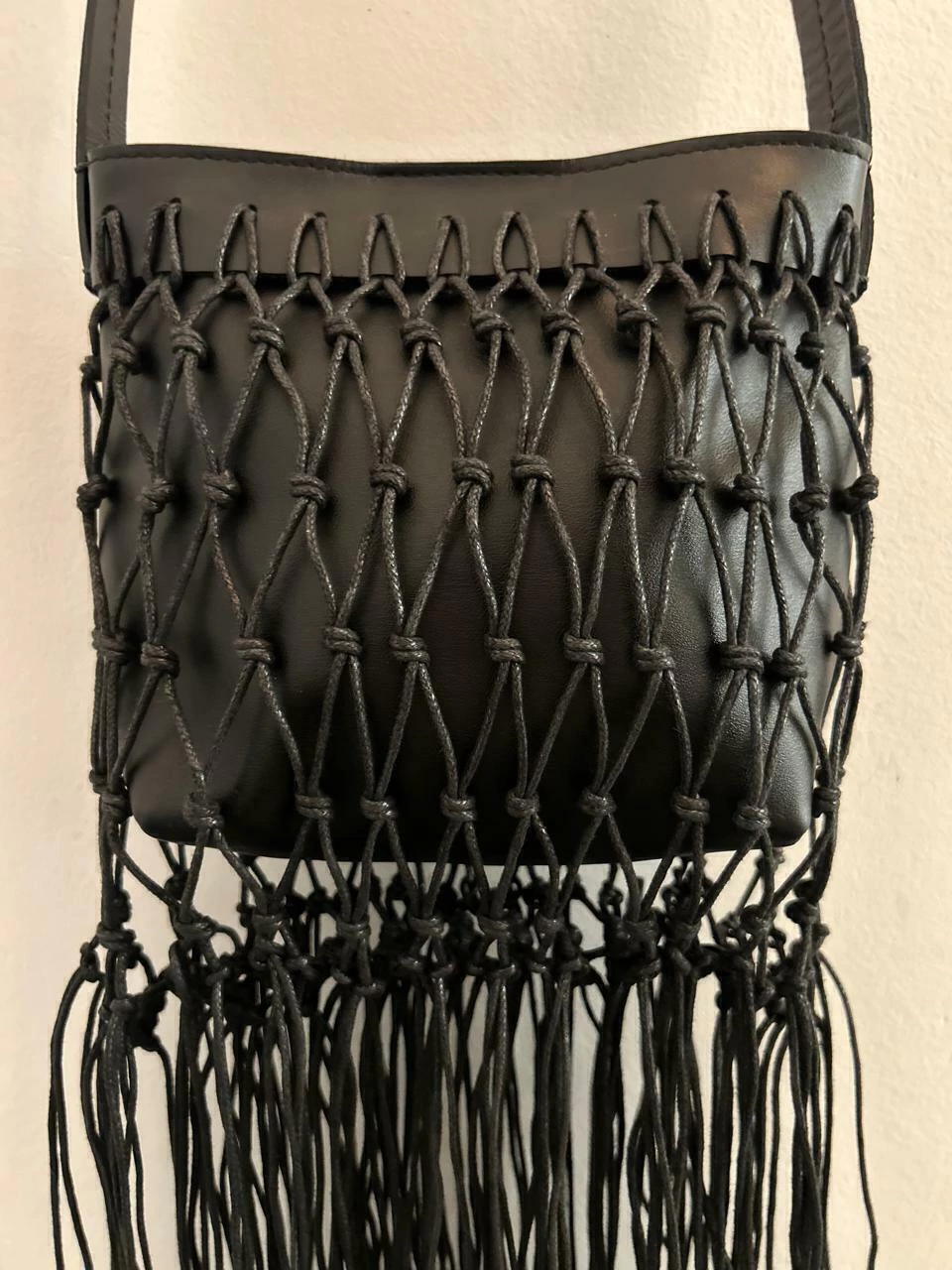 Cartera crossbody elaborada en cuero y macramé con hilos de algodón, cierre con broche imán.