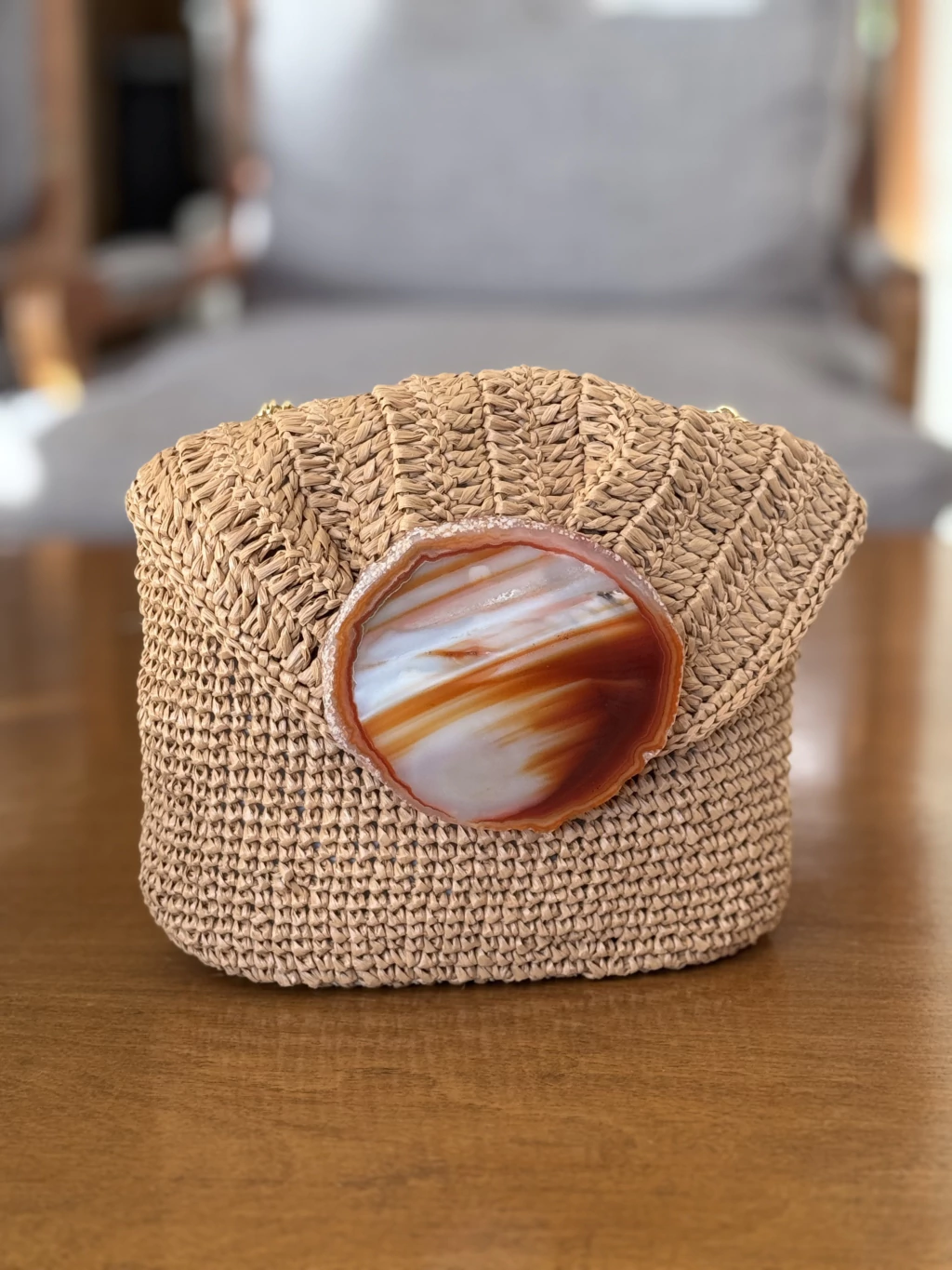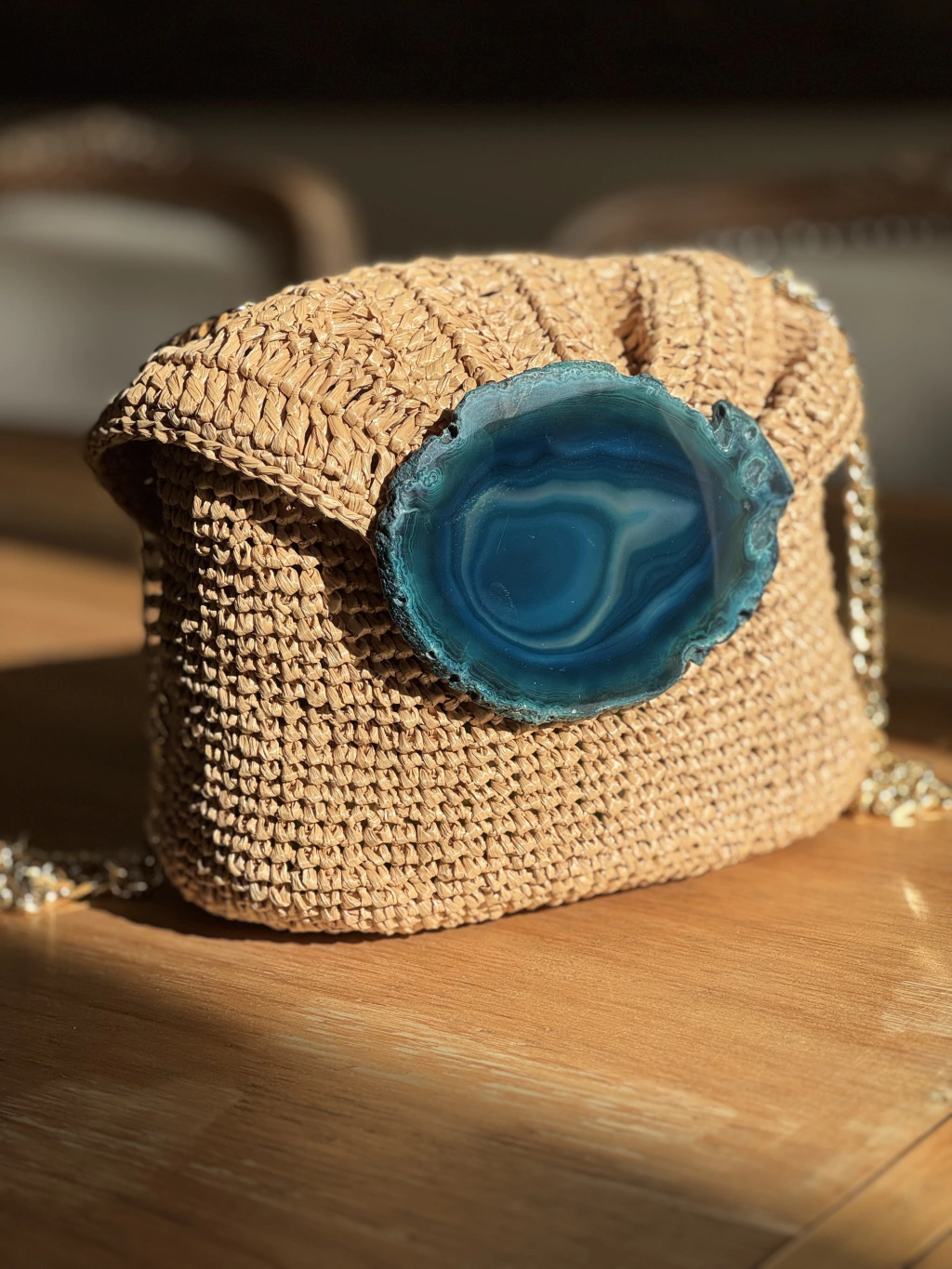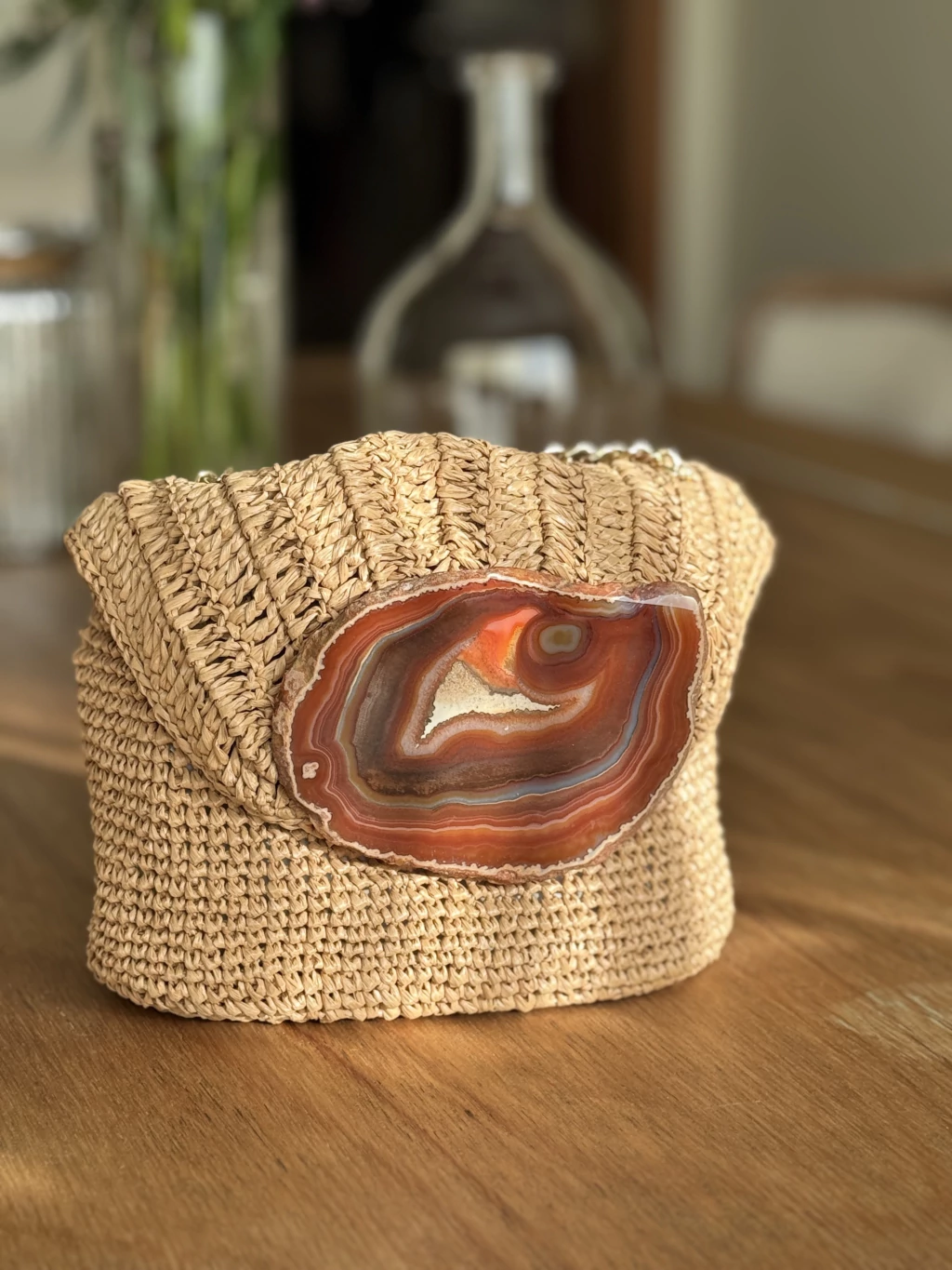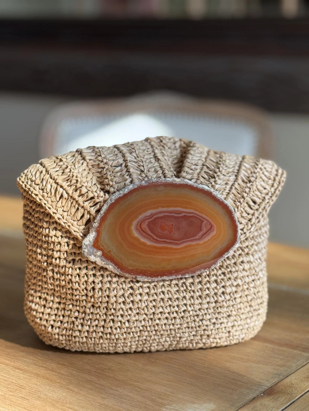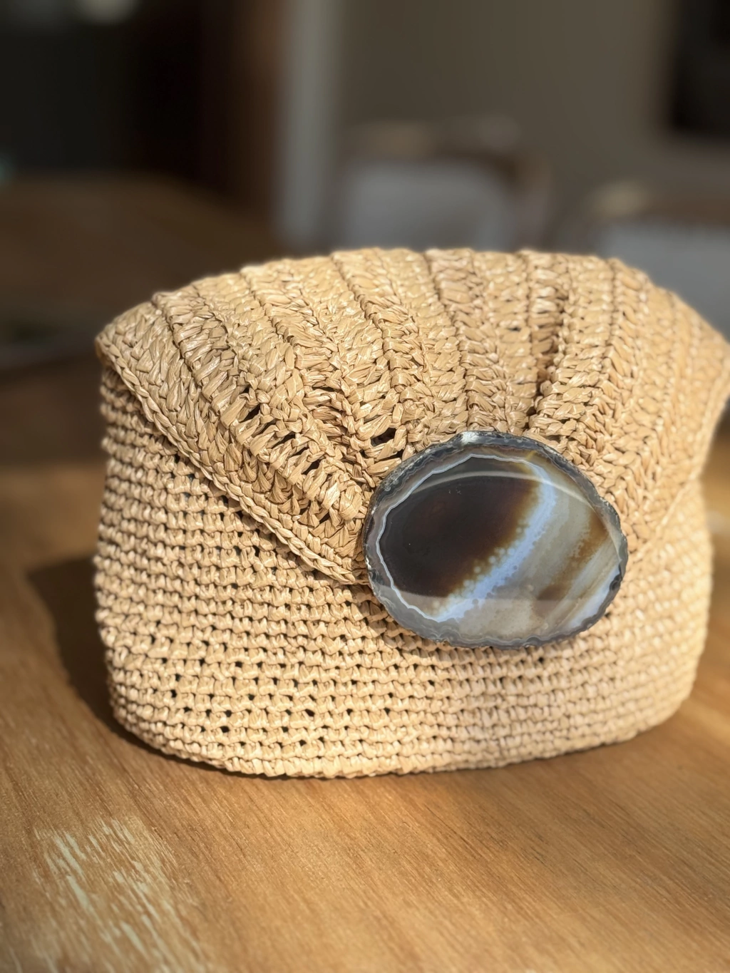 Baulito realizado por artesanas de la comunidad Qom en fibra natural de carandillo utilizando la técnica de cestería Pilaga., con cristales bordados a mano y herrajes en color dorado . Tiene su interior forrado .