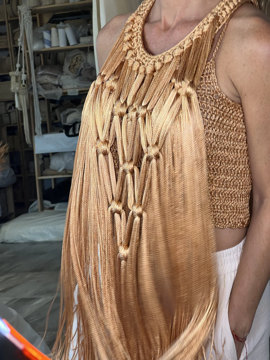 Pechera realizada a mano en técnica crochet, con adorno de nudos de macramé y top en el mismo tono con el ancho regulable.