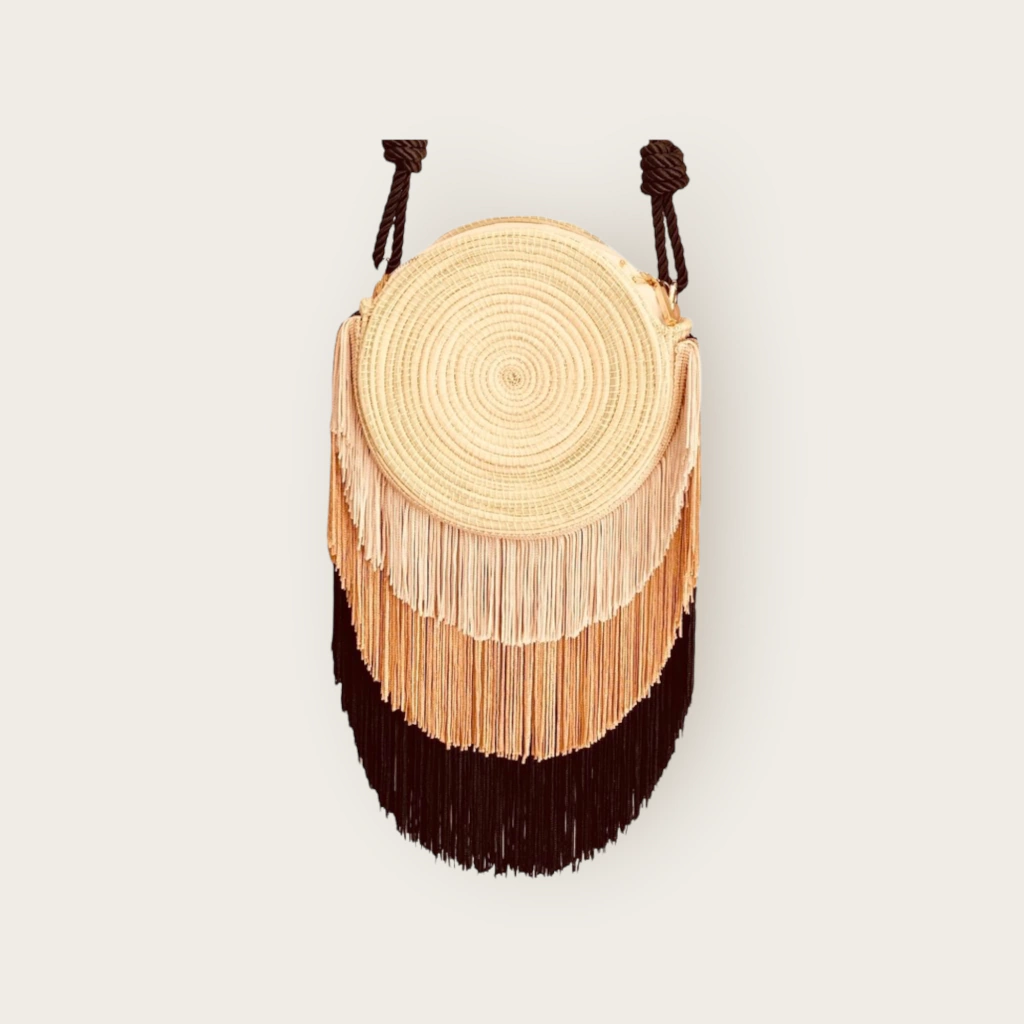 Cartera de fibras naturales (carandillo o espartillo) con flecos de seda de 30 cm el mas largo de color a eleccion se puede elegir hasta tres colores, la correa puede ser cordon de algodon cadena dorada o cordon de seda ( incluye una sola correa las otras se pueden comprar por separado)